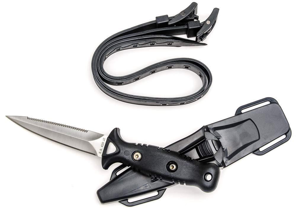 Pointed tip, 2 5/8 serrated edge easy to disassemble for maintenance. Includes plastic sheath and rubber straps.
