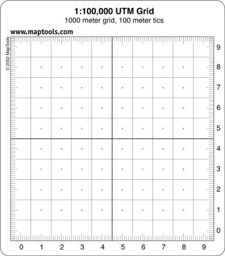 1:100,000 Scale UTM Grid Overlays Fast and easy UTM plotting This easy to use grid tools divide a 10 kilometer grid square into 1 kilometer squares. Align the tool on the map grid and read off the easting and northing values. Additionally, by using a straight edge and the 100m tics along the edge, it is possible to locate a point with 100m precision. Printed on 30 mil plastic stock the tools are about the thickness of a credit card. The ink is coated to protect it from abrasion. Approximate size is 5" by 4.5" (12.5cm X 11cm).